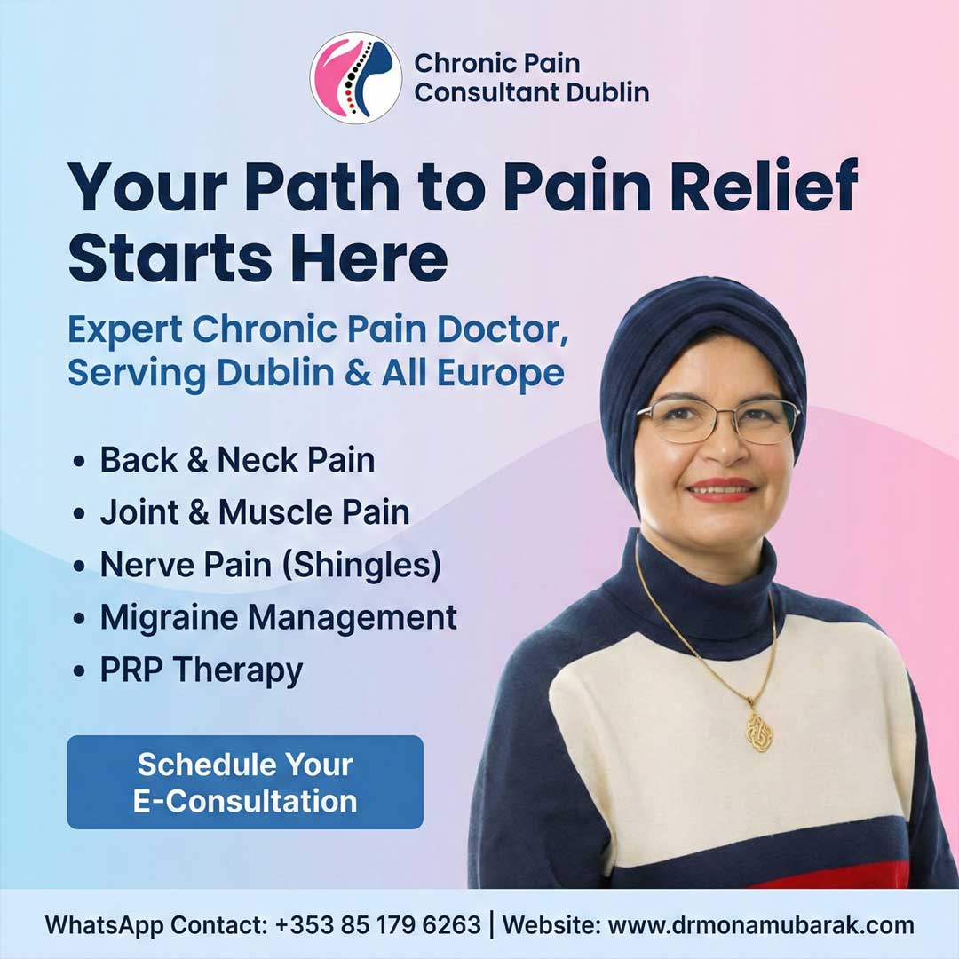 Dr. Mona Mubarak, a full-time Consultant in Chronic Pain Management and Anaesthesia, provides holistic, patient-centered care to help you regain control and improve your quality of life. With international training and vast experience across Ireland, the UK, Australia, and the USA.